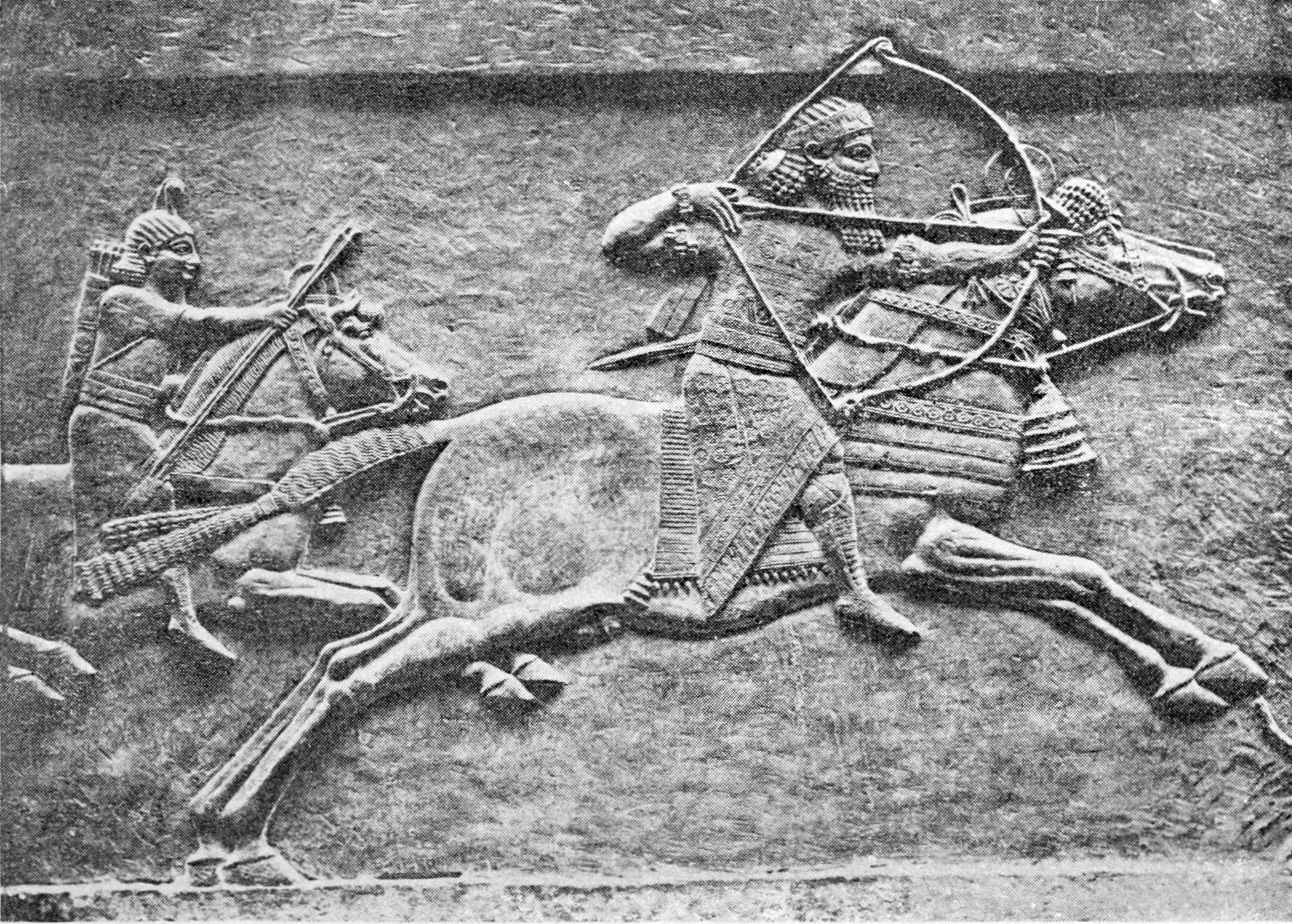 Assurbanipal (Sardanapalus), King of Assyria from 668 to 626 b. c., hunting wild asses. 1893 <https://commons.wikimedia.org/wiki/File:The_Art_of_Horsemanship_-_Assurbanipal_(Sardanapalus),_King_of_Assyria.png> Public Domain
